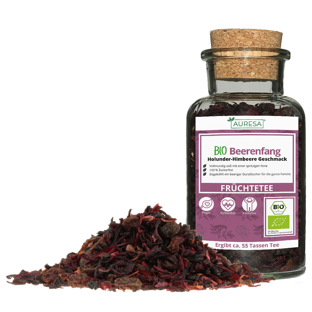 Aufgegossen zeigt dieser Bio Früchtetee seine kräftige, dunkelrote Tassenfarbe. Dafür sorgen Hibiskusblüten, die dem Tee auch ein leicht säuerliches und frisches Aroma verleihen. Bei der Zusammensetzung unseres Bio Beerenfang haben wir gänzlich auf Zucker verzichtet. Damit ist er auch schon für die allerkleinsten Teefreunde geeignet. Und gerade Kinder sind es, die den Tee mit seiner schönen roten Farbe und seinem fruchtigen Duft besonders toll finden.
