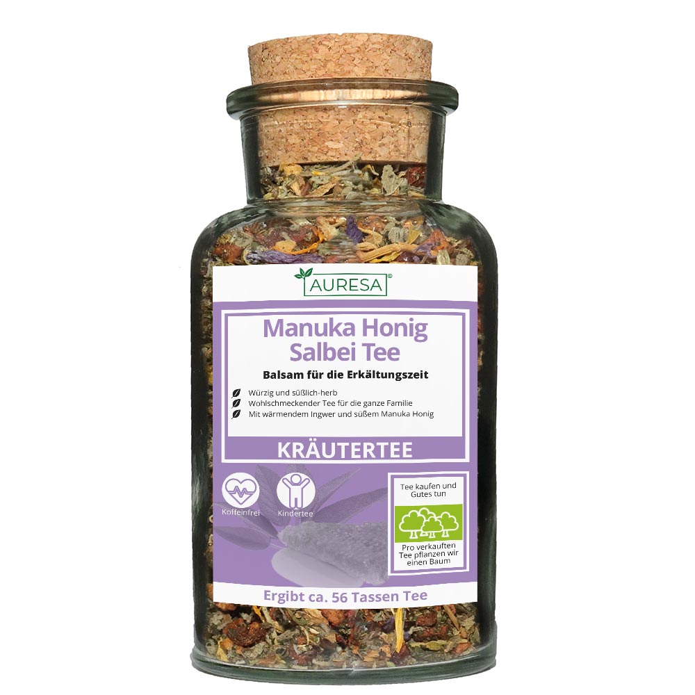 Manuka Honig Salbei Tee (100g Verpackungsinhalt): Dieser Kräutertee besticht durch hochwertigen Manuka Honig und einen großen Anteil an Salbeiblättern. Sein Geschmack ist würzig-süß und da er koffeinfrei ist, kann er auch bereits von Kindern problemlos getrunken werden.