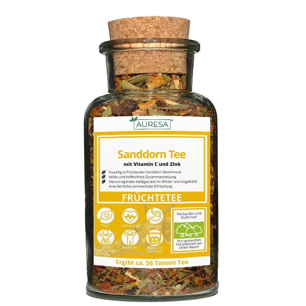 Sanddorn Tee (100g Verpackungsinhalt): Die kleine gelbe Frucht verleiht diesem Tee eine süße und zugleich spritzige Note. Zusätzlich zu der säurearmen Zusammensetzung enthält der Früchtetee noch eine extra Portion Vitamin C und Zink. Beim Aufbrühen erstrahlt der Tee in einem kräftigen Gelb und lässt so jeden Tag die Sonne in der Tasse aufgehen.
