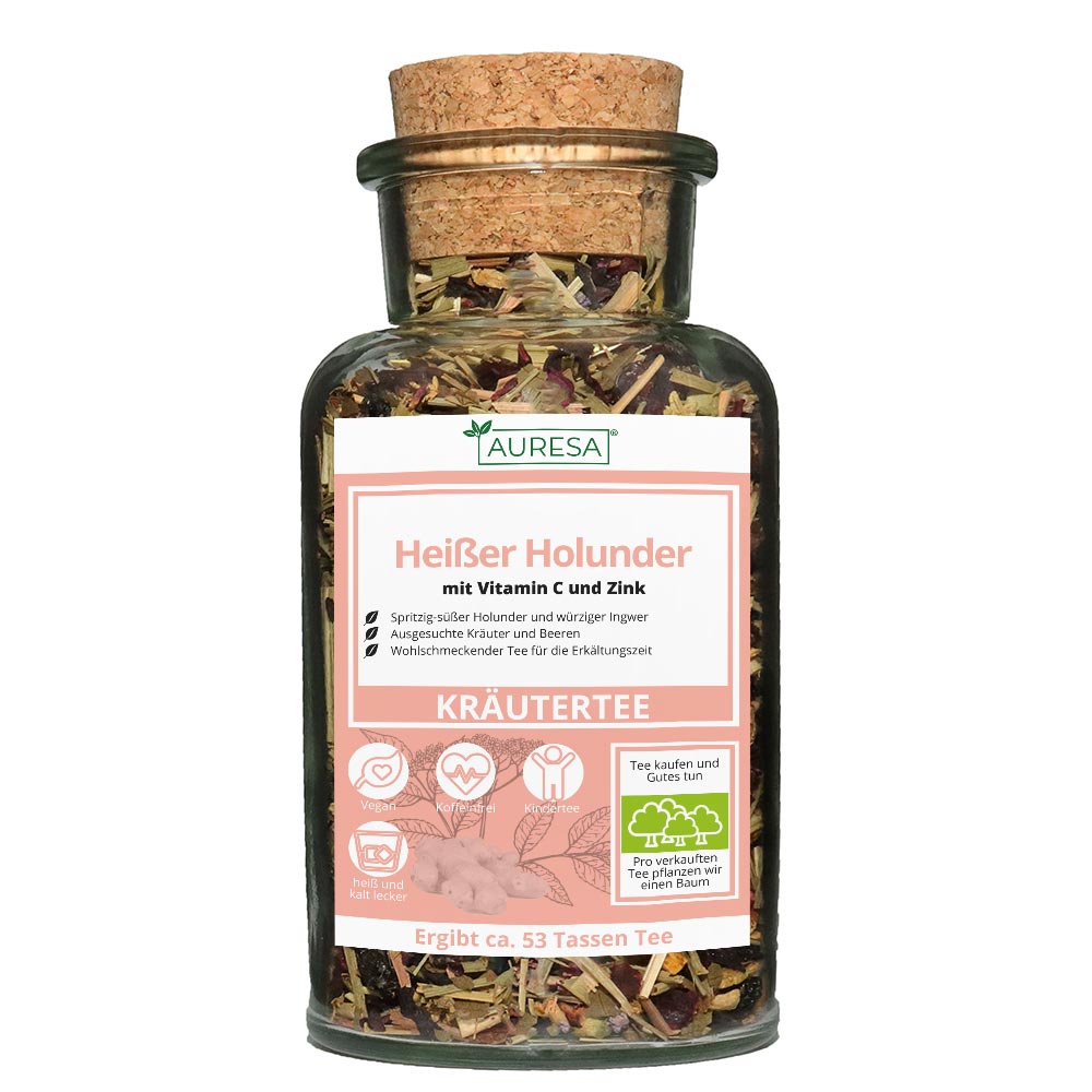 Heißer Holunder (70g Verpackungsinhalt): Ein Kräutertee mit ausgesuchten Kräutern, spritzig-süßen Holunderbeeren und würzigem Ingwer, wärmt von innen und enthält obendrein noch zusätzliches Vitamin C und Zink. Diese Zutaten machen aus ihm einen hervorragenden Tee für die Erkältungszeit.