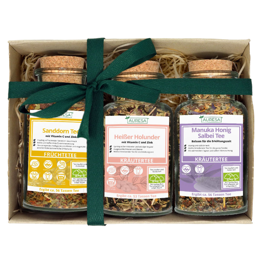 Dieses koffeinfreie Tee Geschenkset besteht aus einem Früchtetee und zwei Kräutertees, die auch bei allerschlimmstem Schmuddelwetter für gute Laune sorgen.