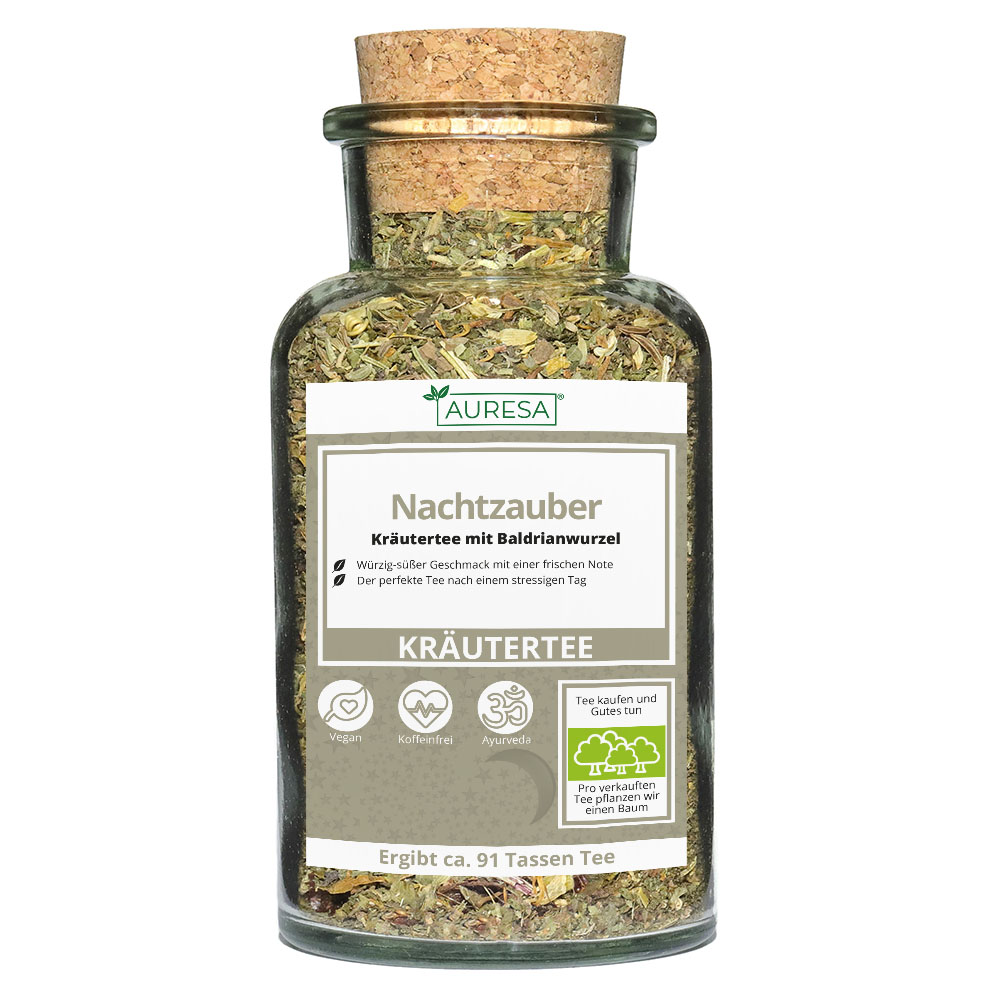 Nachtzauber (100g Verpackungsinhalt): Dieser Kräutertee besitzt einen würzigen und leicht süßen Geschmack und eignet sich aufgrund der enthaltenen Baldrianwurzeln besonders für den Genuss vor dem Schlafengehen. Mit einem Löffel Honig verfeinert schmeckt der Tee auch bereits Kindern.