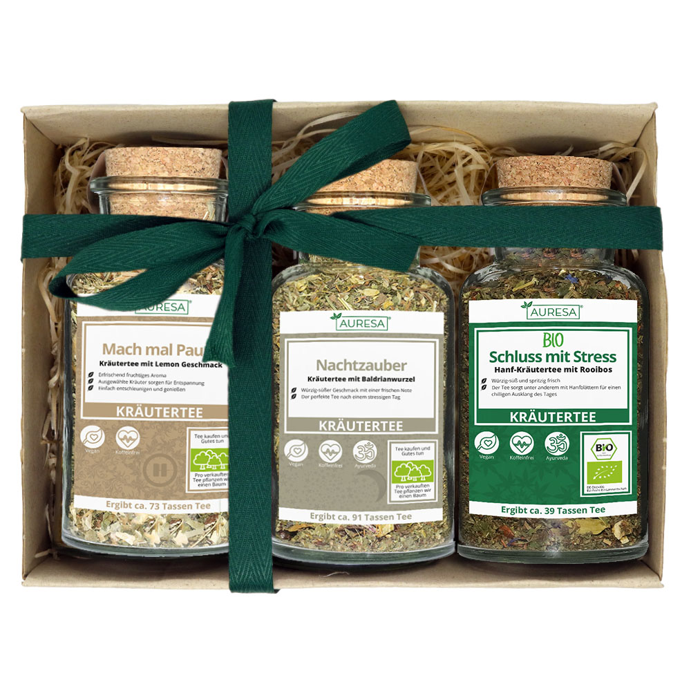 Nach einem anstrengenden Tag die Füße hochlegen und einen Moment der Ruhe und Entspannung genießen – das geht mit diesem Tee Set ganz leicht: einfach eine der drei feinen Kräutertee Sorten öffnen, sich bereits an deren himmlischem Duft erfreuen, den losen Tee in einen Teebeutel oder in ein Tee-Ei füllen und mit kochendem Wasser zubereiten. Schon nach wenigen Minuten können Sie den fantastischen Geschmack einer heißen Tasse Tee genießen und einfach mal abschalten. Diese Tee Box ist perfekt, um einem Lieblingsmenschen oder natürlich auch sich selbst eine Freude zu machen.