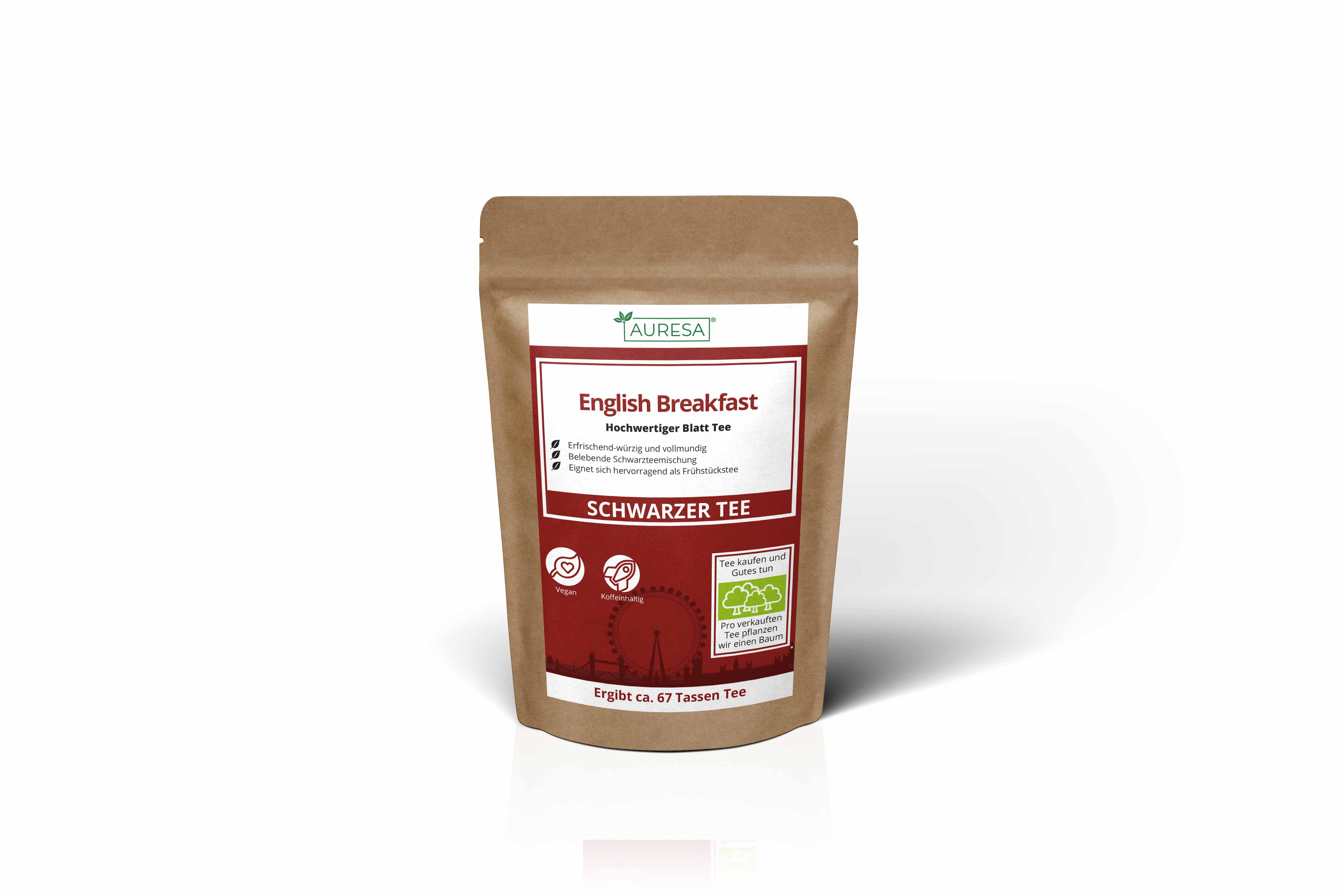 Unser English Breakfast Tea besteht aus einem kräftigen Assam und einem würzigen Ceylon. Diese Mischung sorgt nicht nur für eine belebende Wirkung, sondern auch für einen vollmundigen Geschmack der die Lebensgeister weckt. Sein Aufguss hat ein leicht golden schimmerndes hellbraun und besitzt ein intensives Aroma. Für eine Tasse English Breakfast Tea nehmen Sie etwa einen Teelöffel losen Tee aus unserer wiederverschließbaren Doypack-Verpackung und übergießen sie mit kochendem Wasser. Lassen Sie den Tee für zwei bis drei Minuten ziehen. Eine Ziehzeit über drei Minuten lässt den Tee in der Regel bitter werden und führt zu einer eher beruhigenden als aufputschenden Wirkung, da die austretenden Bitterstoffe das Koffein hemmen. Der English Breakfast Tea kann entweder pur getrunken oder mit einem Schuss Milch, Zitrone und/oder Zucker verfeinert werden.