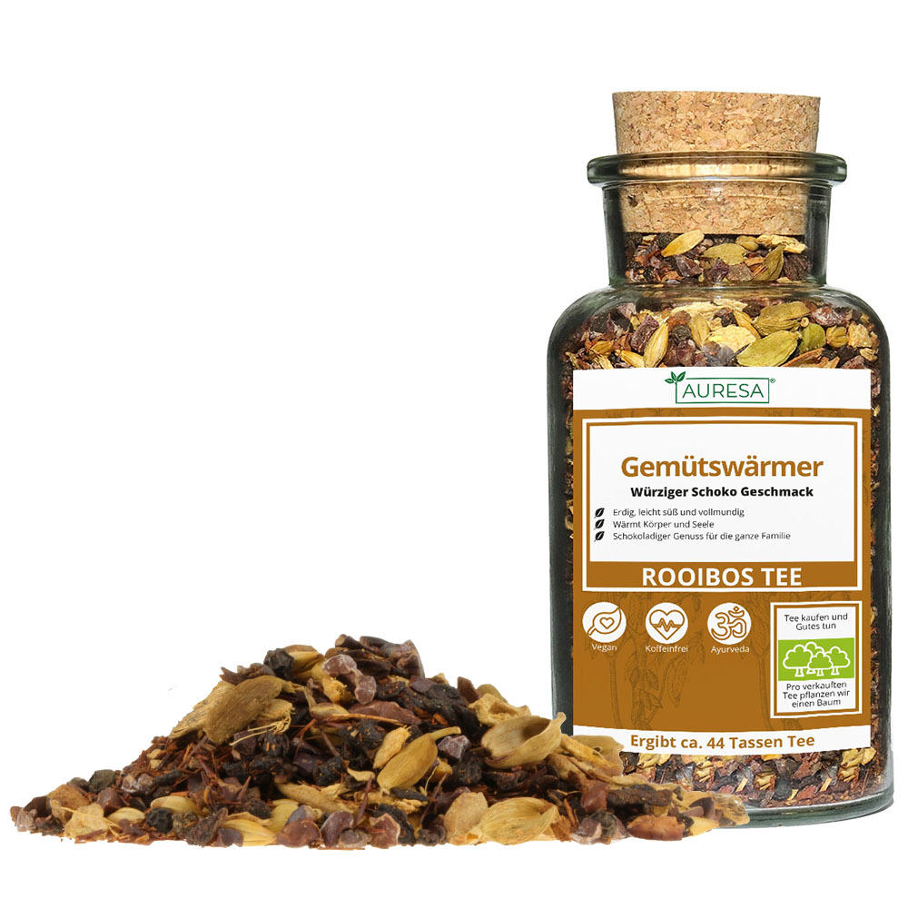 Dieser Tee macht seinem Namen alle Ehre, denn er wärmt Körper und Seele und taut garantiert auch das frostigste Gemüt wieder auf. Das Besondere an unserem Rooibos Tee Gemütswärmer – sowohl kleine als auch große Schoko-Fans können sich über diesen Tee freuen. Er enthält nämlich keinerlei koffeinhaltige Zutaten.