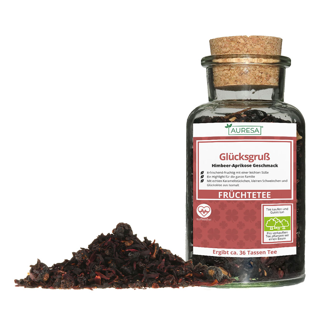 Durch die kleinen Karamellstückchen, Glücksschweinchen und Kleeblätter, die nach dem Aufgießen mit sprudelnd kochendem Wasser damit beginnen, sich aufzulösen, erhält unser Früchtetee Glücksgruß eine wahrhaft himmlische Süße. Selbst die allergrößten Naschkatzen kommen hier also auf ihre Kosten – und müssen dazu nicht einmal mehr zusätzlichen Zucker in den Tee geben.
