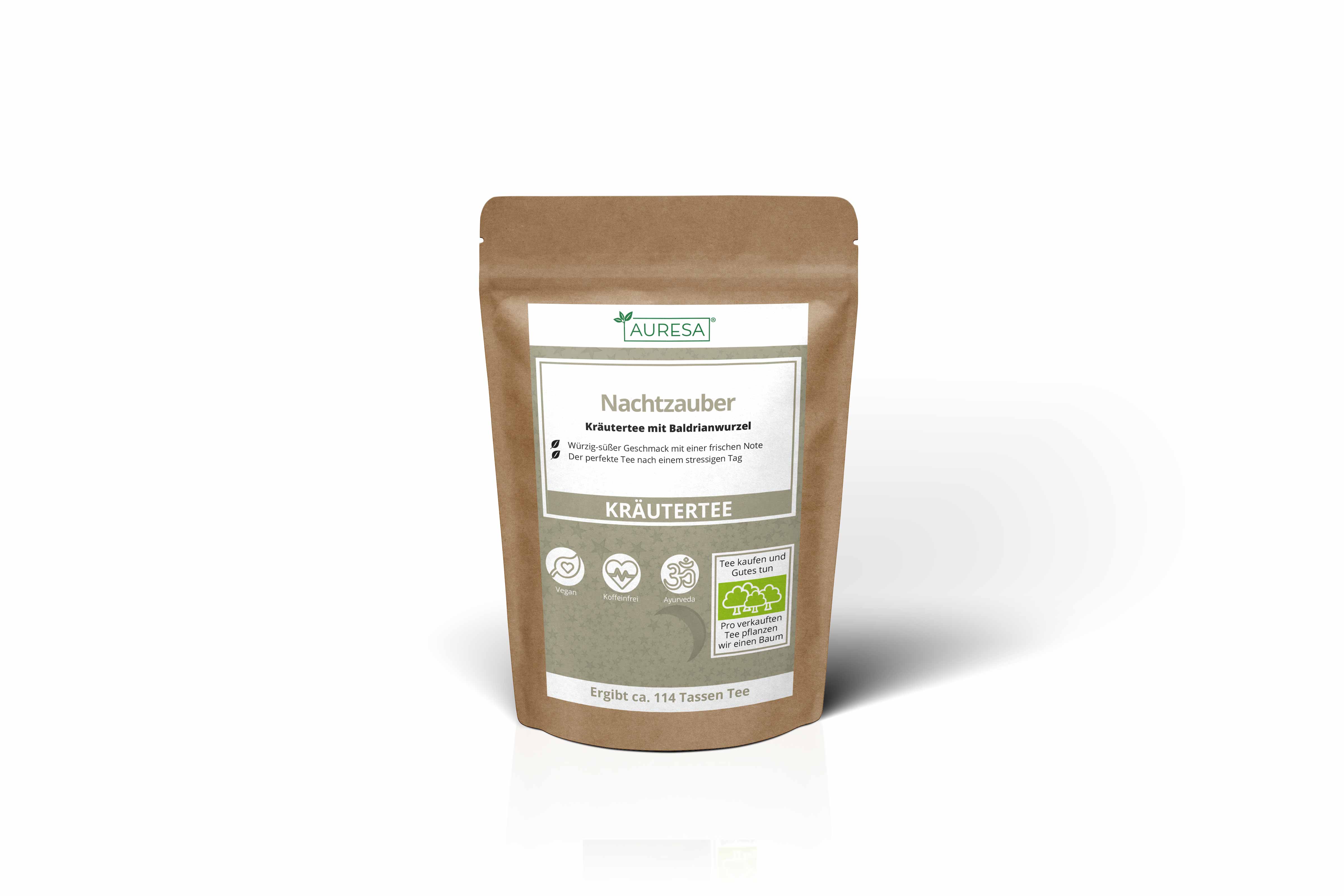Bei unserem Kräutertee Nachtzauber handelt es sich um einen naturbelassenen Tee. Er besteht nur aus sorgfältig ausgewählten und zusammengestellten Kräutern und enthält weder zugesetzte Aromen noch Zucker. Er schmeckt am besten frisch aufgebrüht und noch warm und ist sowohl pur als auch mit etwas Honig verfeinert so richtig lecker. Da er weder grünen noch schwarzen Tee enthält, ist unser Nachtzauber komplett koffeinfrei. Deshalb darf er auch schon von Kindern getrunken werden und auch Schwangere und Stillende dürfen hier gerne zur Teetasse greifen.